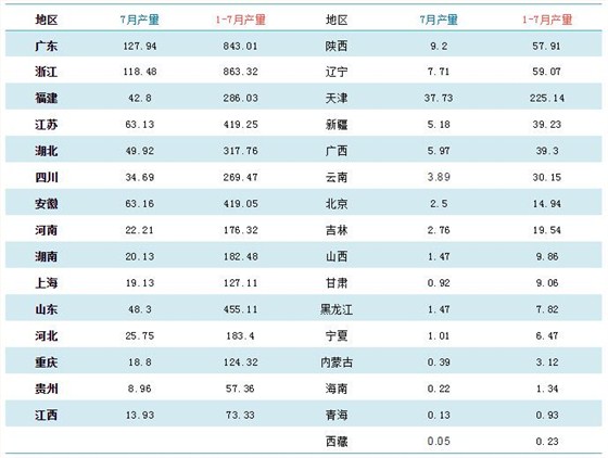 1-7月塑料制品累計產(chǎn)量排名前五位(廣東、浙江、安徽、江蘇和湖北)的總產(chǎn)量達(dá)到2862.39萬噸,占到全國總產(chǎn)量53.8%(7月規(guī)模企業(yè)統(tǒng)計)