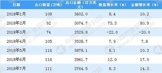 2013年-2015年中國(guó)塑料制品出口金額呈增長(zhǎng)趨勢(shì),2016年中國(guó)塑料制品出口金額有小幅度下降;2018年1-7月中國(guó)塑料制品出口金額為24087.9百萬(wàn)美元,同比增長(zhǎng)11.5%。