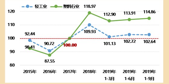 2019年前三季度塑料制品行業(yè)對(duì)美累計(jì)出口額為126.3億美元。塑料制品行業(yè)中美出口貿(mào)易指數(shù)在2019年持續(xù)保持在相對(duì)高位運(yùn)行,且隨著美國對(duì)部分塑料制品已加征關(guān)稅商品進(jìn)行排除等利好因素支撐,行業(yè)中美出口貿(mào)易指數(shù)小幅走高,1-9月該指數(shù)為114.86,較1-6月升高0.91點(diǎn),比同期輕工業(yè)中美出口貿(mào)易指數(shù)高12.22點(diǎn)。