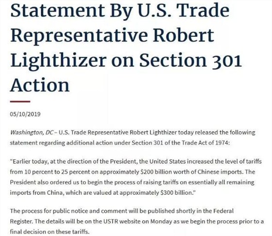 據(jù)最新消息,美國(guó)貿(mào)易代表辦公室(USTR)在其官網(wǎng)發(fā)布了一則聲明表示,特朗普總統(tǒng)下令將提高對(duì)剩下的所有中國(guó)產(chǎn)品的關(guān)稅,其涉及金額約為3000億美元。