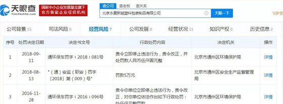 北京華融瑞源包裝廠在2018年9月被質(zhì)量技術(shù)監(jiān)督局責(zé)令改正違規(guī)生產(chǎn)行為,2019年4月又被環(huán)境保護(hù)局罰款兩萬元。