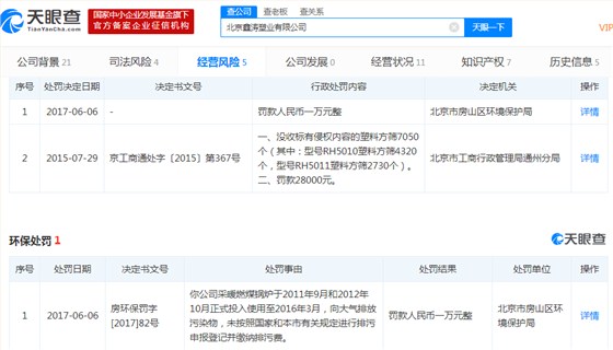 北京鑫濤塑業(yè)有限公司同樣受到兩個(gè)處罰,2015年7月因侵權(quán)問題被工商行政管理局罰款兩萬八千元。2017年6月又因鍋爐排放造成大氣污染被環(huán)境保護(hù)局罰款一萬元。