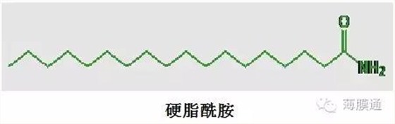 爽滑劑的作用是為了減小薄膜表面的摩擦系數,從而確保良好的后續(xù)加工性,比如在包裝機上的走機性能。常見的爽滑劑主要為脂肪酸酰胺,碳鏈的長度為18到22個碳。碳鏈可以是飽和的,也可以含有一個C=C不飽和雙鍵。例如有:硬脂酰胺,油酸酰胺和芥酸酰胺。