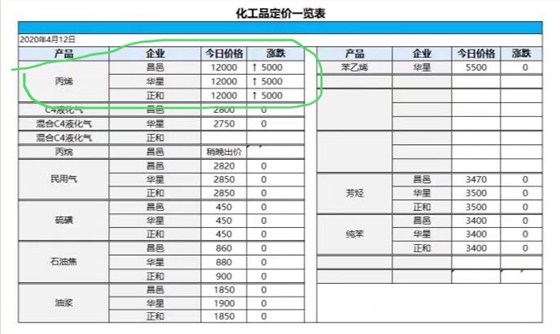 暴漲的聚丙烯粉料深深刺痛了丙烯工廠的心,周日丙烯也漲5000元/噸。山東丙烯市場(chǎng)主流價(jià)格從4月10日的5900-6000元/噸的價(jià)格一路暴漲至4月12日的8000元/噸,價(jià)差高達(dá)2050元/噸,漲幅34.5%。 4月12日,山東昌邑石化有限公司等丙烯最新報(bào)價(jià)暴漲,漲5000元/噸至12000元/噸。