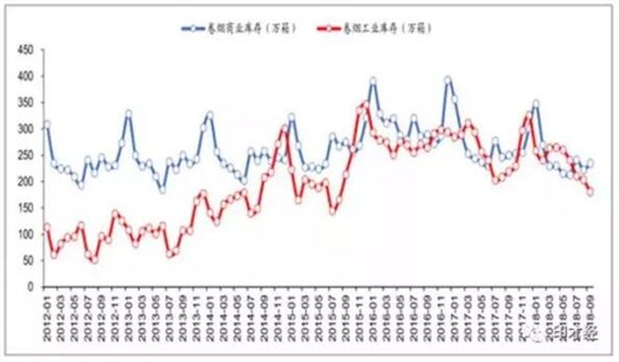 (2)根據(jù)煙草專賣局?jǐn)?shù)據(jù),截止2018年9月,卷煙工商業(yè)庫存降至415.45萬箱,大致回到2014年合理水平。