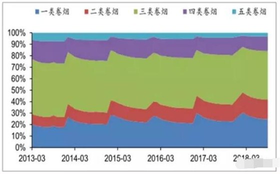 下游煙草產(chǎn)品結(jié)構(gòu)變化,中高端、創(chuàng)新產(chǎn)品占比提升。2016年,煙草銷量下滑中,經(jīng)典款銷量增長(zhǎng)動(dòng)力略顯不足。以高端卷煙“中華”品牌為例,“中華”香煙2016年銷量134.97萬箱,同比減少18.46萬箱,下滑約12%。主要原因是新品大量發(fā)布、提稅順價(jià)過程中,經(jīng)典品牌的配套維護(hù)措施不到位。2017年,煙草公司前期發(fā)布的新品逐步取得成效,同時(shí)創(chuàng)新產(chǎn)品貢獻(xiàn)增量。配合去庫存的階段性成果,產(chǎn)品結(jié)構(gòu)優(yōu)化轉(zhuǎn)變推動(dòng)了2017-2018年煙草行業(yè)銷量的回暖。
