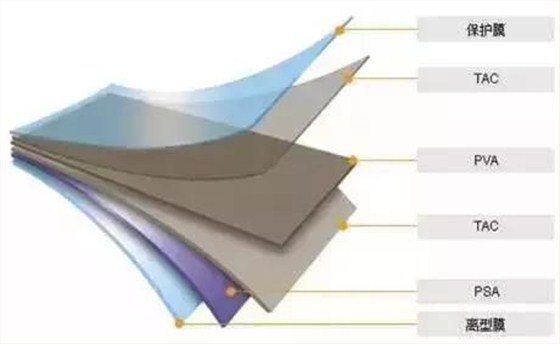 而偏光片是由偏光膜(PVA)、保護(hù)膜(TAC)、壓敏膠層、離型膜、保護(hù)膜、光學(xué)補(bǔ)償膜等復(fù)合而成,基本結(jié)構(gòu)是兩層 TAC 膜夾一層拉伸后的 PVA 膜。