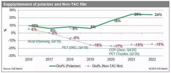 但在未來(lái)非TAC薄膜(如PMMA膜,PET和COP薄膜)的供應(yīng)將比需求短缺16%,新產(chǎn)線的增加也只能防止供給缺口的進(jìn)一步擴(kuò)大,短缺水平將保持在15%。