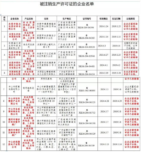 從統(tǒng)計的數(shù)據(jù)來看,在這12家被撤銷生產(chǎn)許可證的企業(yè)里,有10家是從事塑包印刷的企業(yè),其中有4家來自東莞市,3家來自中山市,2家來自潮州市,1家來自河源市。