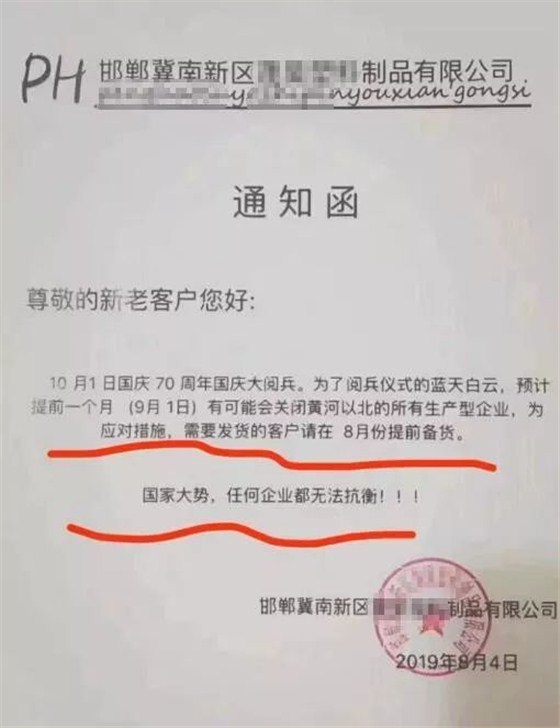 這份發(fā)布于8月4日的通知函出自邯鄲冀南一家塑料制品公司,通知函稱:為保證10月1日國(guó)慶閱兵儀式的藍(lán)天白云,預(yù)計(jì)提前一個(gè)月,從9月1日起關(guān)閉黃河以北的所有生產(chǎn)型企業(yè)。