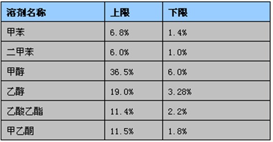 表1列出了幾種常用溶劑的可爆燃范圍。為了避免爆燃,使用循環(huán)風(fēng),不斷地向凹印機(jī)的干燥裝置輸送空氣,控制可燃?xì)鈿怏w量在爆燃下限的1/2以下。