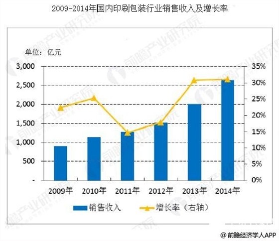 據(jù)前瞻產(chǎn)業(yè)研究院《中國(guó)包裝行業(yè)市場(chǎng)前瞻與投資戰(zhàn)略規(guī)劃分析報(bào)告》數(shù)據(jù)顯示,我國(guó)包裝印刷行業(yè)銷售收入自2009年以來(lái)呈現(xiàn)逐年上升的趨勢(shì)。2014年我國(guó)包裝印刷行業(yè)的銷售收入突破2600億元。