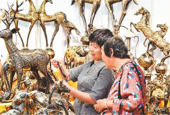 9月23日,在廣西南寧舉行的第十六屆中國(guó)—東盟博覽會(huì)上,“一帶一路”相關(guān)國(guó)家的參展商帶來的商品吸引眾多參觀者前來選購。圖為參觀者在南寧國(guó)際會(huì)展中心選購巴基斯坦青銅器。新華社記者曹祎銘攝