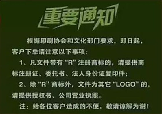 浙江義烏市政府相關(guān)負(fù)責(zé)人提醒:各印刷廠負(fù)責(zé)人應(yīng)增強(qiáng)責(zé)任感,守牢法律底線,嚴(yán)格按照印刷行業(yè)五項(xiàng)制度開(kāi)展工作。今后在承印所有包裝裝潢印刷品時(shí),必須要對(duì)方提供商標(biāo)注冊(cè)證、委托書(shū)、營(yíng)業(yè)執(zhí)照復(fù)印件等,個(gè)人的話需要委托書(shū)及身份證復(fù)印件等。并妥善留存驗(yàn)證的各種證明文件2年,以備出版行政部門(mén)、公安部門(mén)查驗(yàn)。